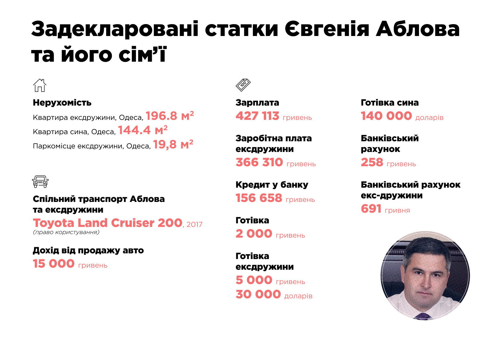 декларація після звільнення, де Аблова зазначає наявність готівкових коштів у кожного з подружжя: 35 та 80 тис відповідно. Сам Федір Аблов заощаджень не декларував.